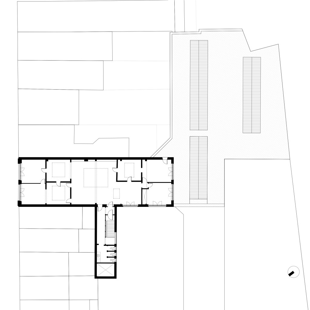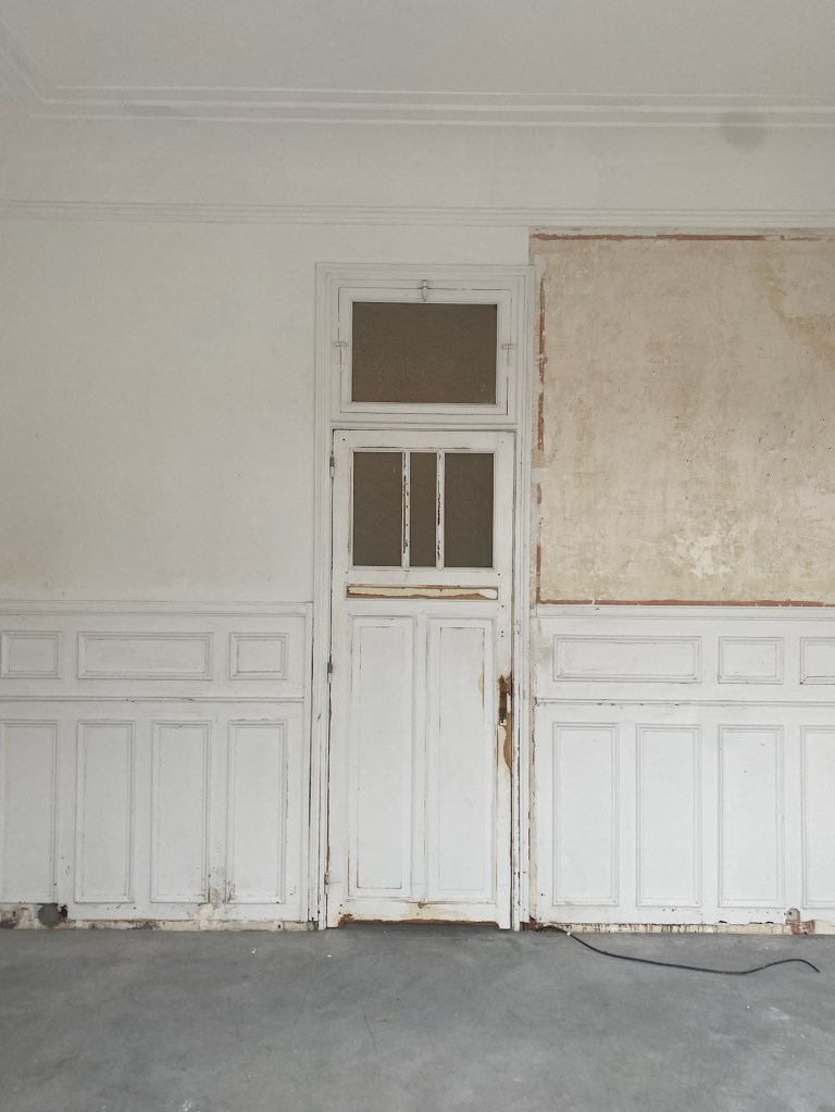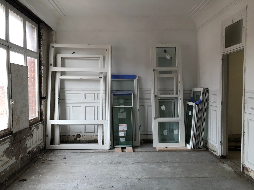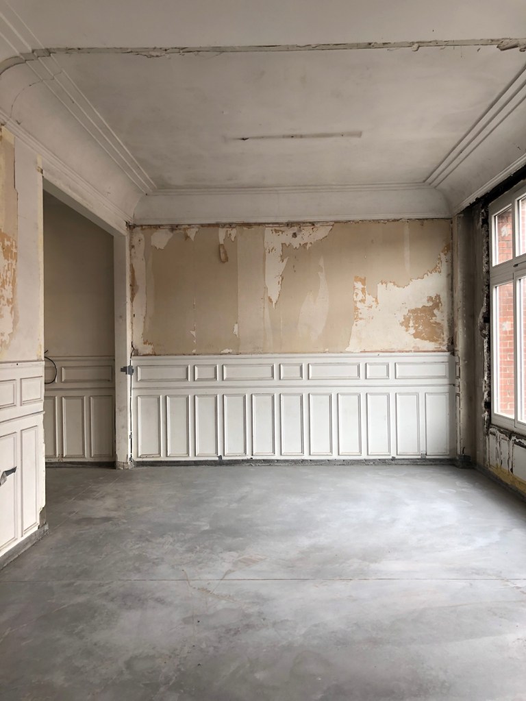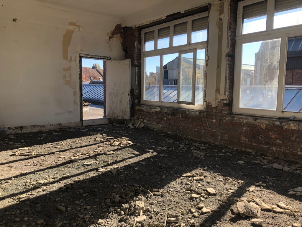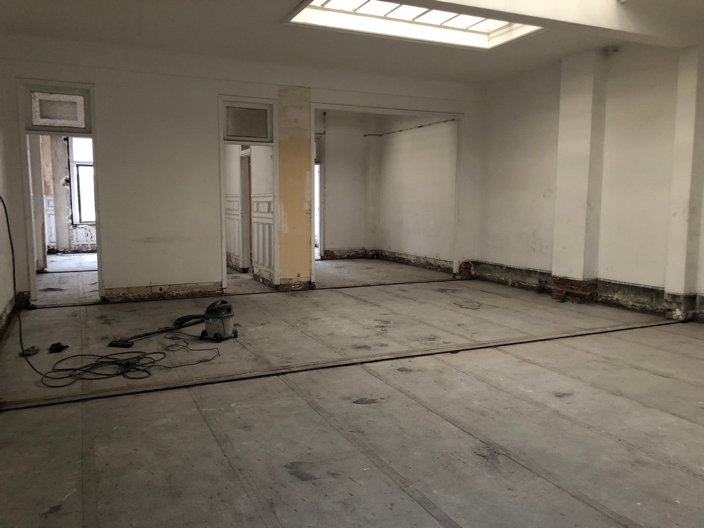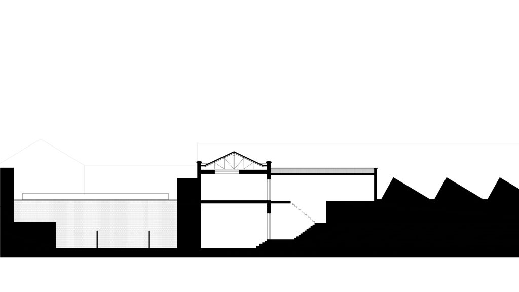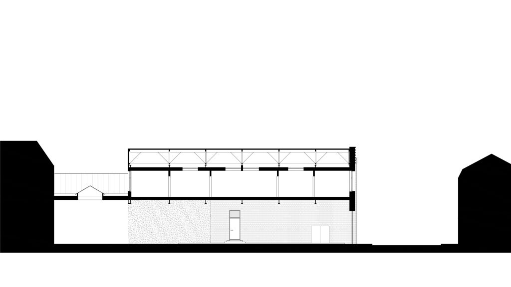 A l’intérieur, l’écriture architecturale conserve les qualités spatiales du lieu. Les éléments non porteurs sont retirés afin d’offrir de grands espaces. Les menuiseries intérieurs ainsi que les moulures des murs et plafonds sont conservées. Une rénovation intégrale du bien est prévue afin d’assainir, isoler et rendre habitable un bâti vétuste.