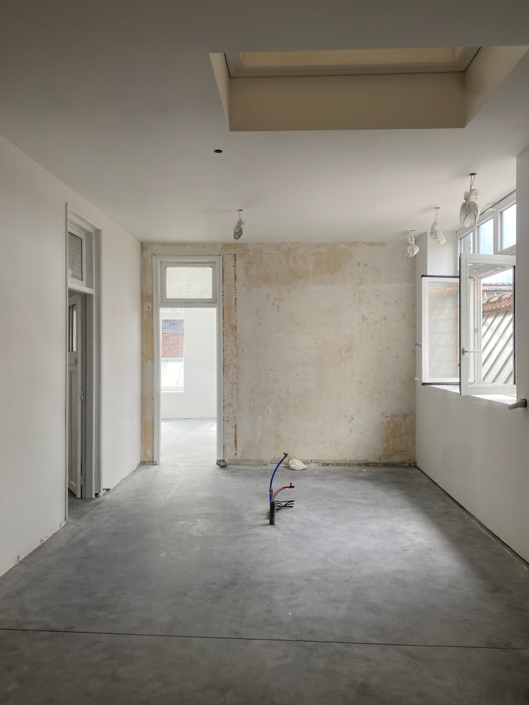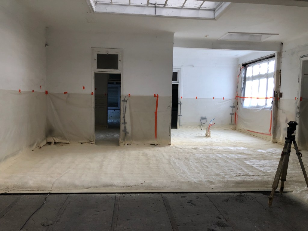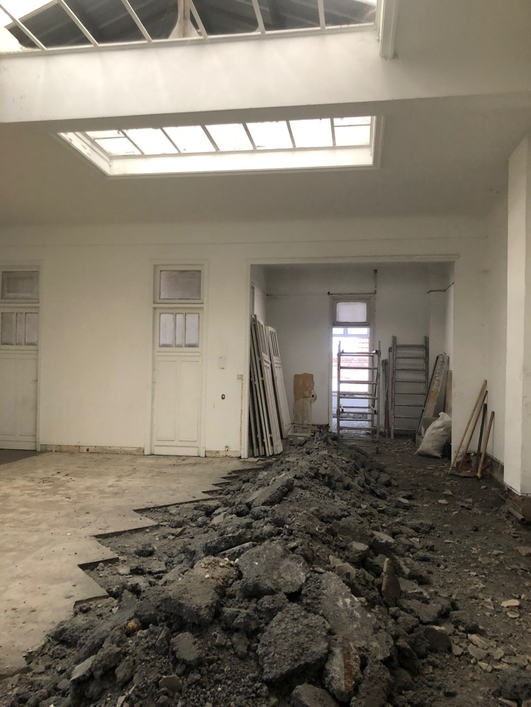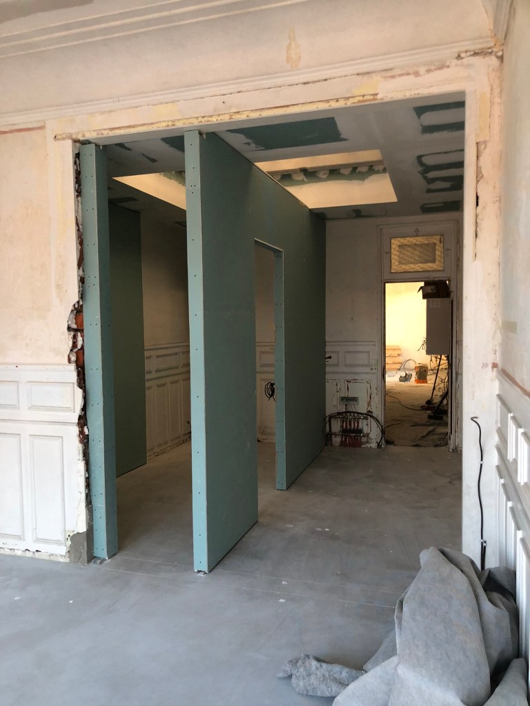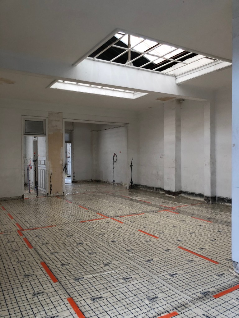 Travaux réalisés : Aménagement intérieurs / Curage + démolition des éléments non porteurs / Remplacement des menuiseries extérieures / Isolation de l’ensemble des sols, murs & plafonds / Installation électrique / Installation plomberie + plancher chauffant / Chape béton quartzé / Plâtrerie / Peinture / Faïence
