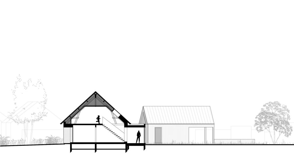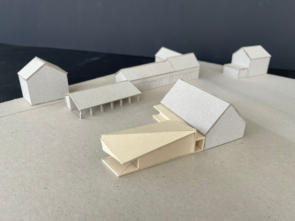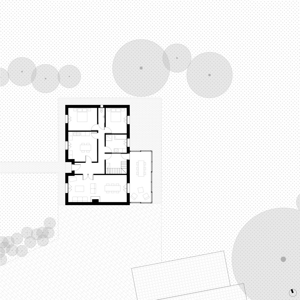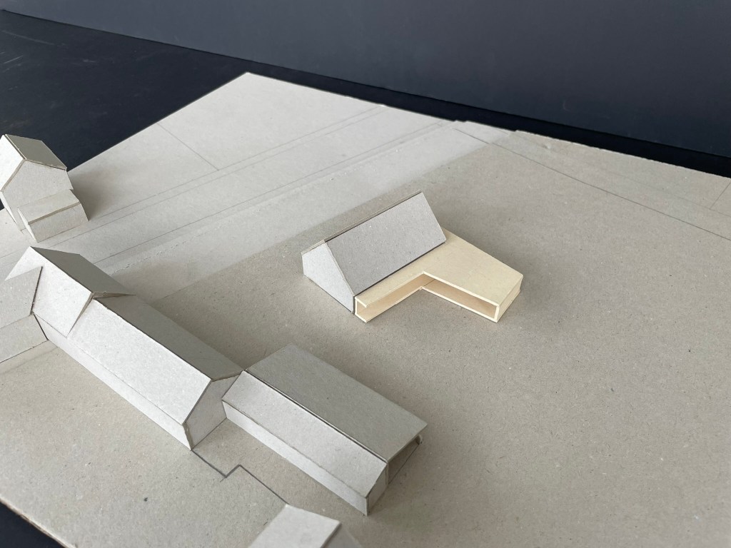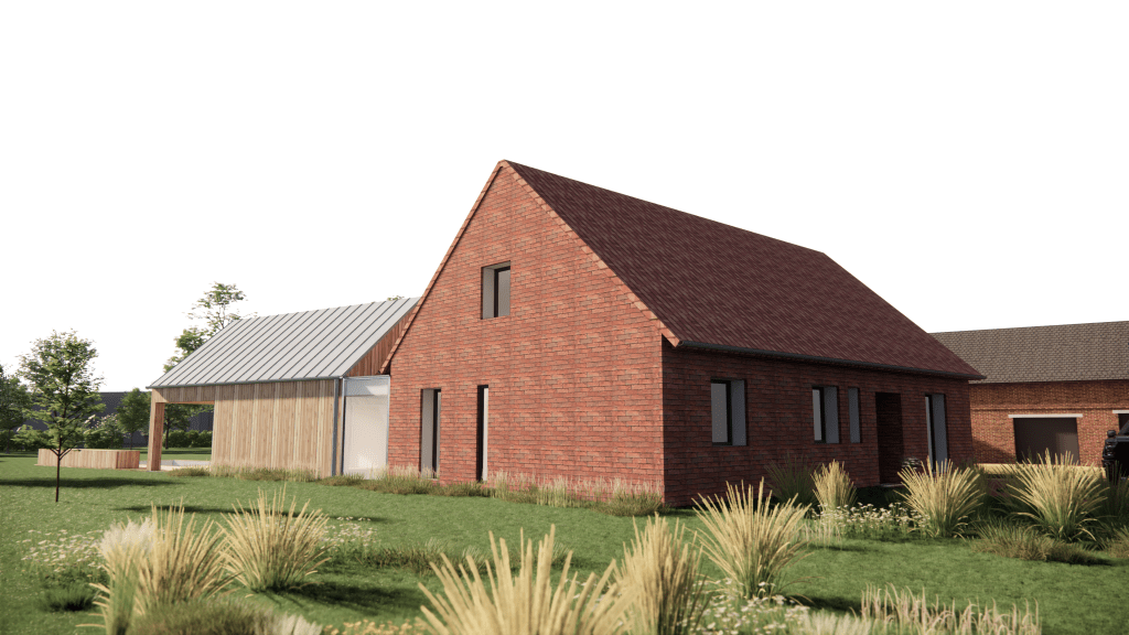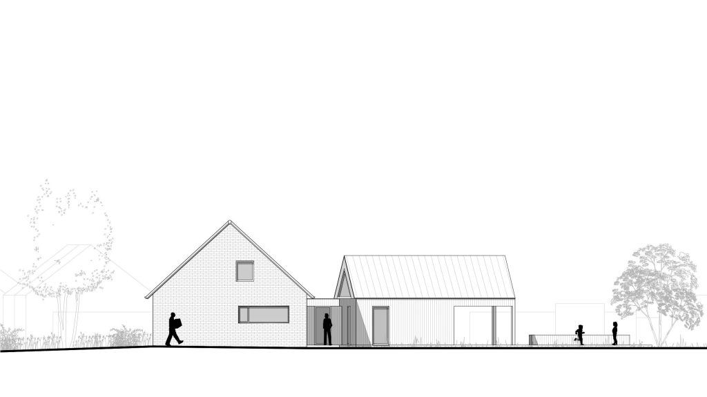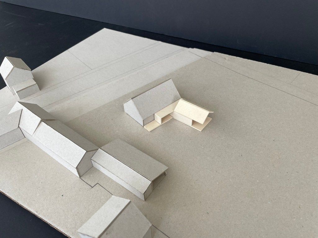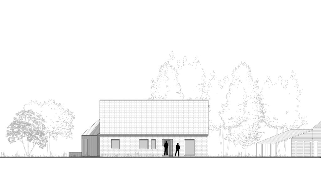 Le projet s’inscrit dans ce tissu urbain existant : l’extension réorganise les espaces entre bâtiments et contexte, autour d’un espace rappelant la typologie des fermes locales. L’orientation de l’extension d’Est en Ouest affirme la rencontre entre un héritage rural et une réinterprétation architecturale contemporaine.