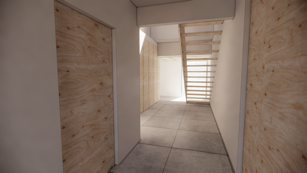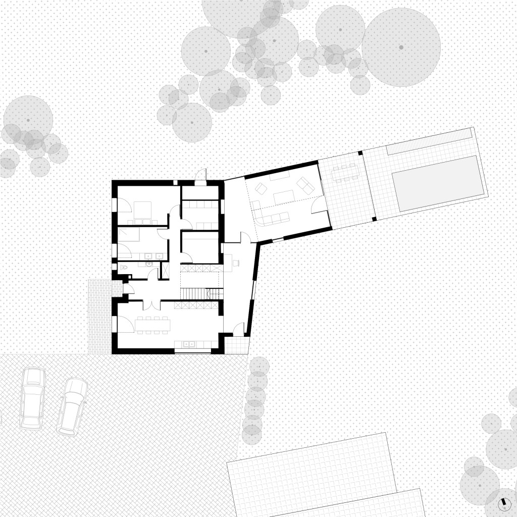 La réorganisation de la partie existante consiste à agrandir les espaces tout en offrant une porosité visuelle à travers le bâtiment. Les pièces sont déplacées selon leur besoin en lumière naturelle ; pièces de nuit au Nord, et pièce de vie au Sud.