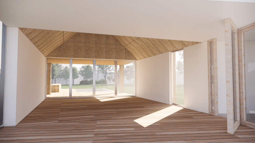 L’extension est construite en ossature bois. Elle accueille une nouvelle entrée fluidifiant la circulation entre les espaces et un salon devenant pièce de vie principale. Il s’ouvre sur une terrasse couverte et une piscine, situées dans son prolongement. Les ouvertures des façades Nord et Sud permettent de profiter de vues dégagées sur l’espace paysager au Nord et l’espace central au Sud.
