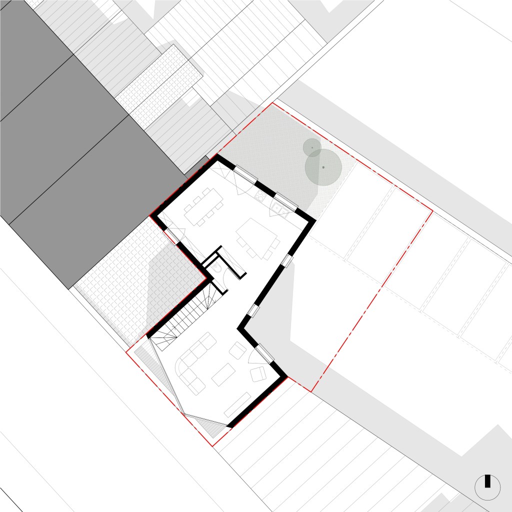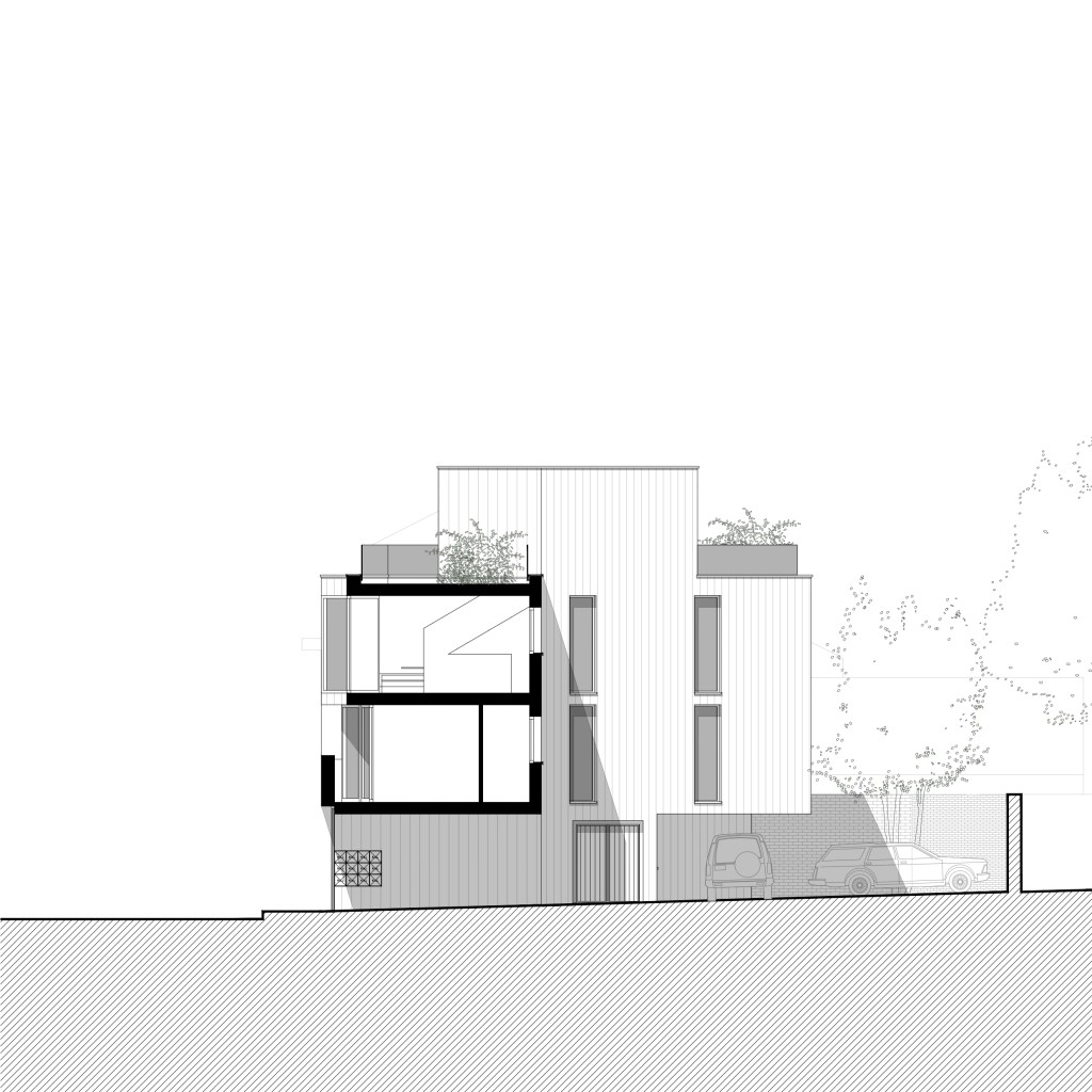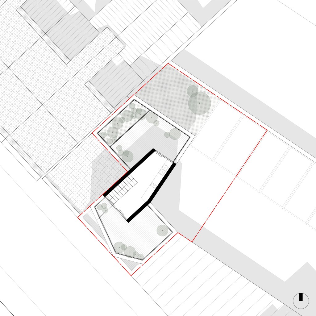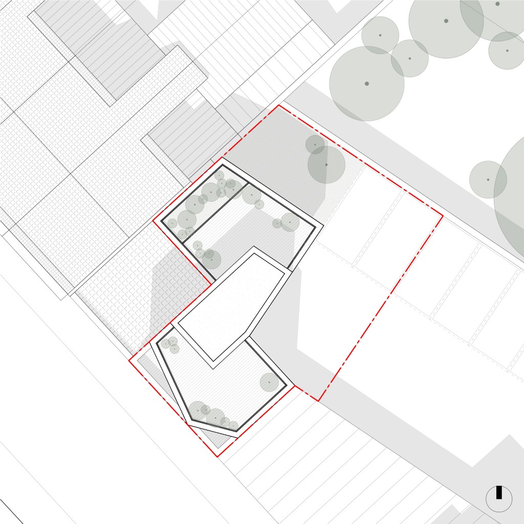 L’imbriquement de ces deux entités génère un espace de transition qui structure le projet. Il accueille la circulation verticale (escalier) et permet de relier les différents niveaux tout en créant un filtre entre l’environnement urbain de la rue Berthelot et le cœur végétalisé de l’îlot.