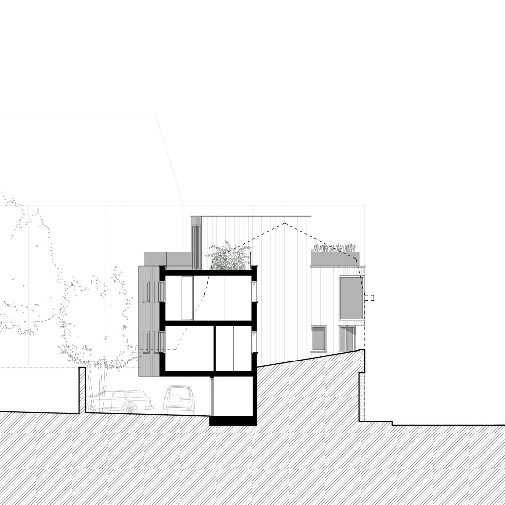 Ce dispositif permet de mettre en relation directe les espaces de vie avec les deux toitures-terrasses du troisième niveau, renforçant la qualité d’usage, l’apport de lumière naturelle et l’ouverture visuelle vers le cœur d’îlot comme vers la rue.
