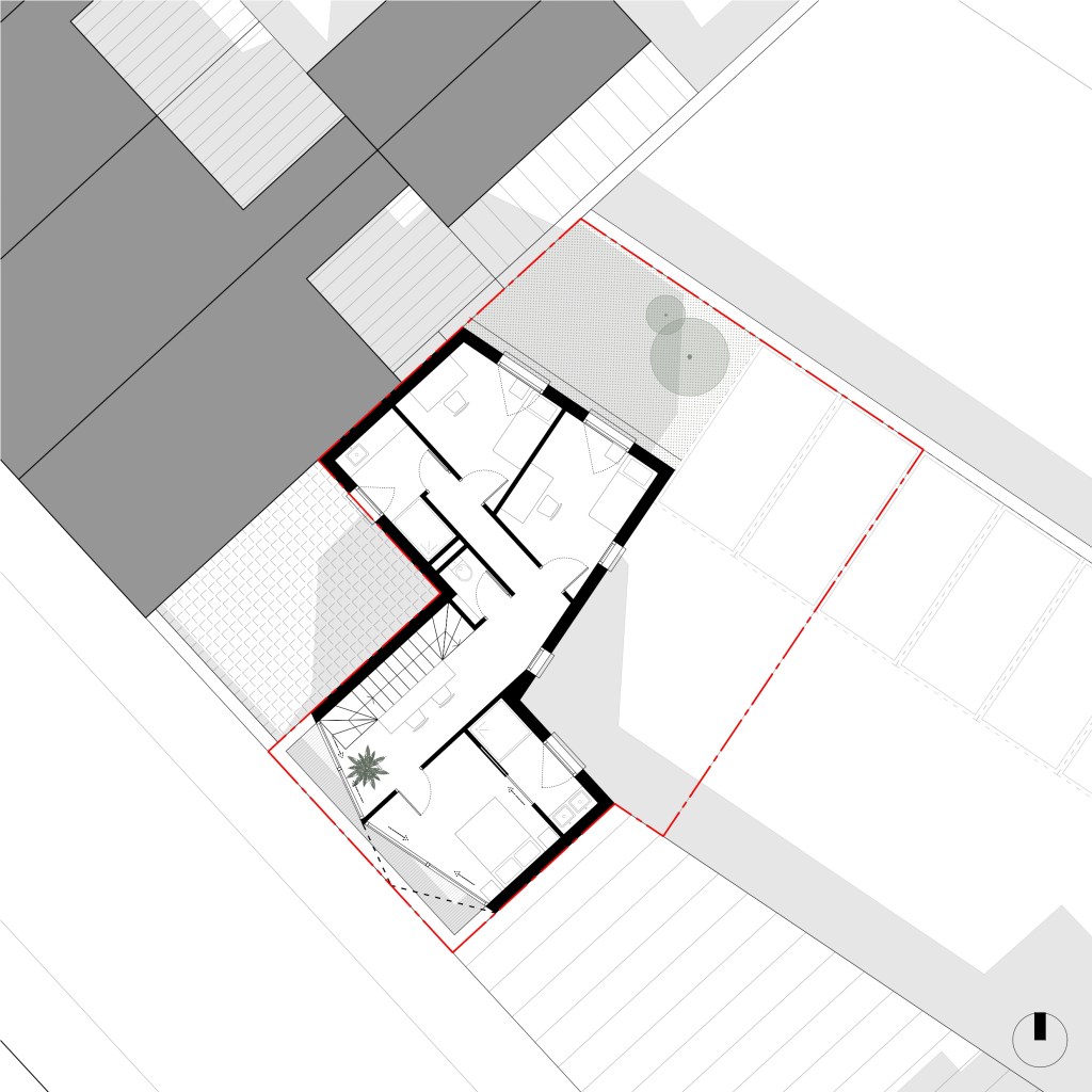 Les pièces de nuit, plus sensibles à l’intimité et nécessitant un apport en lumière naturelle moins important que les pièces de vie, bénéficient d’une protection naturelle grâce à la façade en brique existante, conservée en l’état. Celle-ci forme un garde-corps plein pour les balcons du premier étage. Cette disposition permet de préserver la discrétion visuelle depuis l’espace public tout en offrant des prolongements extérieurs qualitatifs aux chambres.